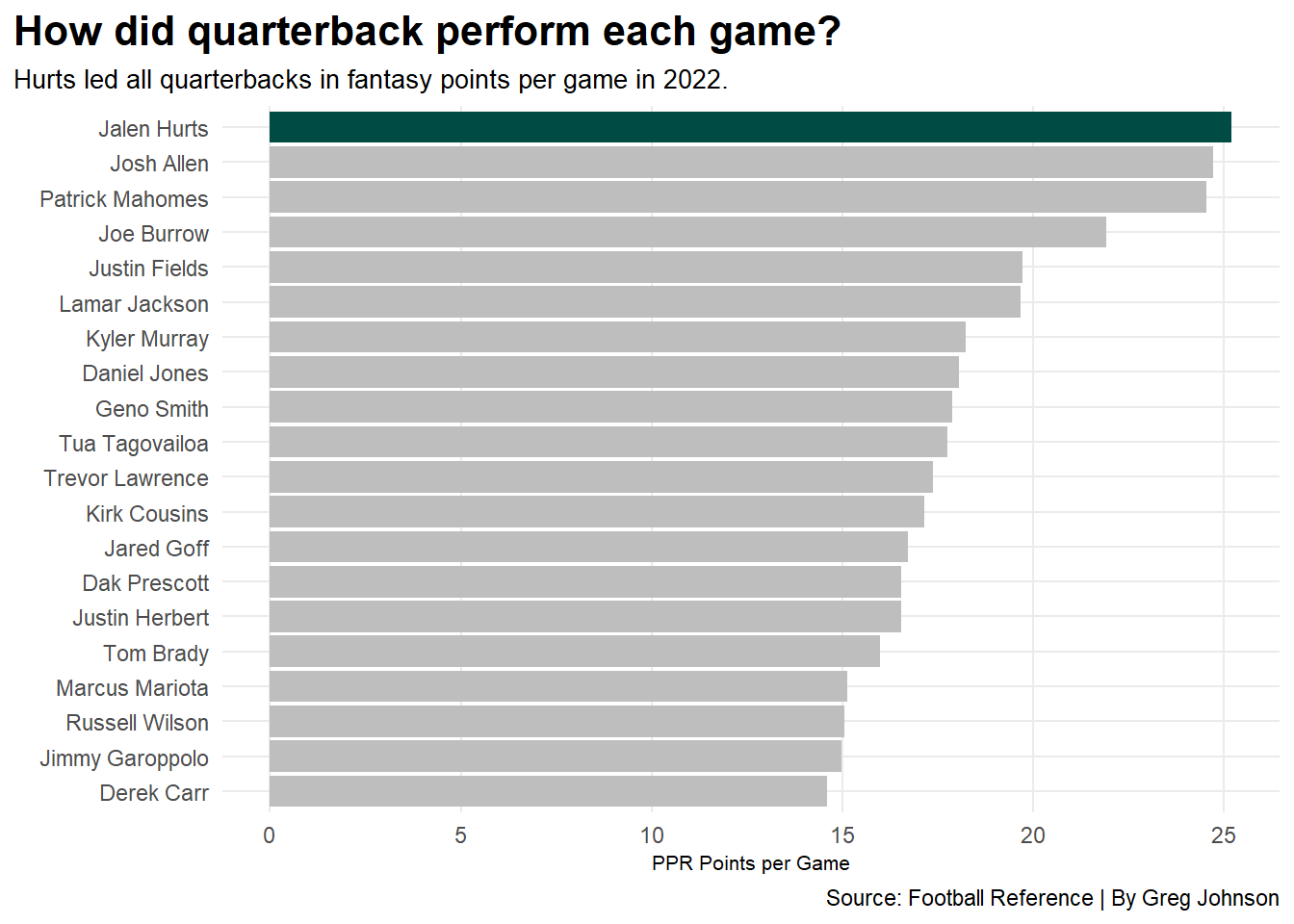 ggplot() +geom_bar(data=qbs, aes(x=reorder(Player, PPR/G), weight=PPR/G), fill="grey" ) +geom_bar(data=jh, aes(x=reorder(Player, PPR/G), weight=PPR/G), fill="#004C45" ) +coord_flip()+labs(title="How did quarterback perform each game?",subtitle="Hurts led all quarterbacks in fantasy points per game in 2022.",x="", y="PPR Points per Game",caption="Source: Football Reference | By Greg Johnson") +theme_minimal() +theme(plot.title =element_text(size =16, face ="bold"),axis.title =element_text(size =8), plot.subtitle =element_text(size=10), panel.grid.minor =element_blank(),plot.title.position="plot" )