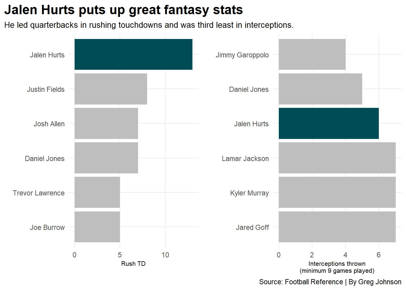 rushtdqbs <- qbs %>%top_n(6, wt=RushTD)intqbs <- qbs %>%top_n(6, wt=-Int)bar1 <-ggplot() +geom_bar(data=rushtdqbs, aes(x=reorder(Player, RushTD), weight=RushTD), fill="grey") +geom_bar(data=jh, aes(x=reorder(Player, RushTD), weight=RushTD), fill="#004C54") +coord_flip() +labs(title="Jalen Hurts puts up great fantasy stats",subtitle="He led quarterbacks in rushing touchdowns and was third least in interceptions.",x="", y="Rush TD\n",caption="") +theme_minimal() +theme(plot.title =element_text(size =16, face ="bold"),axis.title =element_text(size =8), plot.subtitle =element_text(size=10), panel.grid.minor =element_blank(),plot.title.position="plot" )bar2 <-ggplot() +geom_bar(data=intqbs, aes(x=reorder(Player, -Int), weight=Int), fill="grey") +geom_bar(data=jh, aes(x=reorder(Player, -Int), weight=Int), fill="#004C54") +coord_flip() +labs(title="",subtitle="",x="", y="Interceptions thrown\n(minimum 9 games played)",caption="Source: Football Reference | By Greg Johnson") +theme_minimal() +theme(plot.title =element_text(size =16, face ="bold"),axis.title =element_text(size =8), plot.subtitle =element_text(size=10), panel.grid.minor =element_blank() )plot_grid(bar1, bar2)